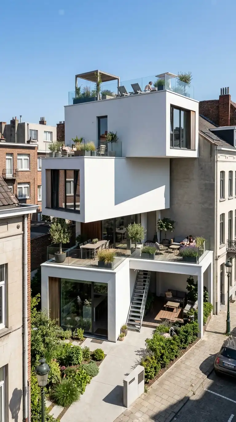 This typology works on small urban sites where the only direction is up. The stacking creates outdoor space — roof terraces, balconies, covered patios — that the site otherwise lacks. The emotional effect is sculptural, playful, and efficient.