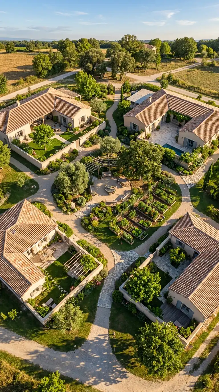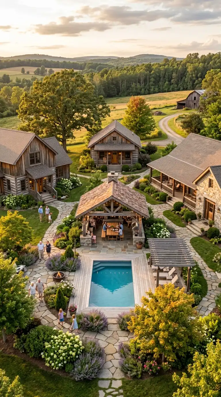 The multi-generational compound places multiple residential units on a single site. Parents in one house, adult children in another, grandparents in a third. Shared spaces — a common kitchen, a workshop, a pool, gardens — sit between the units.