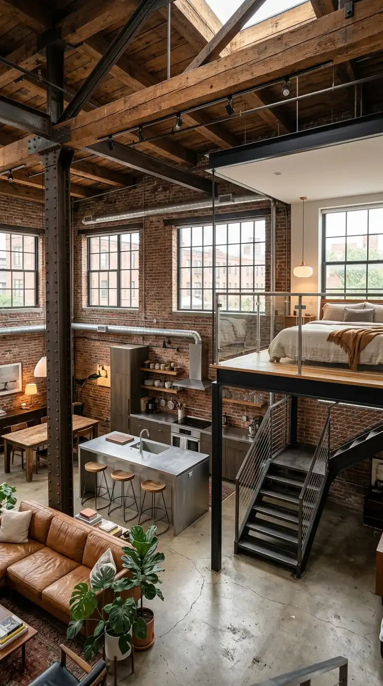 The loft apartment adapts a former industrial or commercial building for residential use. The key features are generous ceiling heights (3.5 metres or more), large windows, exposed structure, and an open plan.