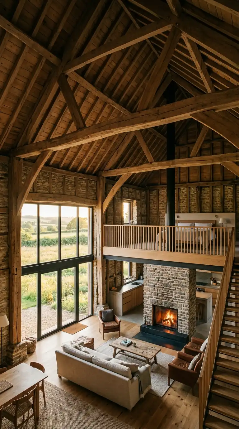 The barn’s original volume is the asset: high ceilings, exposed timber framing, large openings for hay and animals. Bedrooms are often placed in lofts or in new wings. The emotional effect is rustic, historic, and deeply characterful.