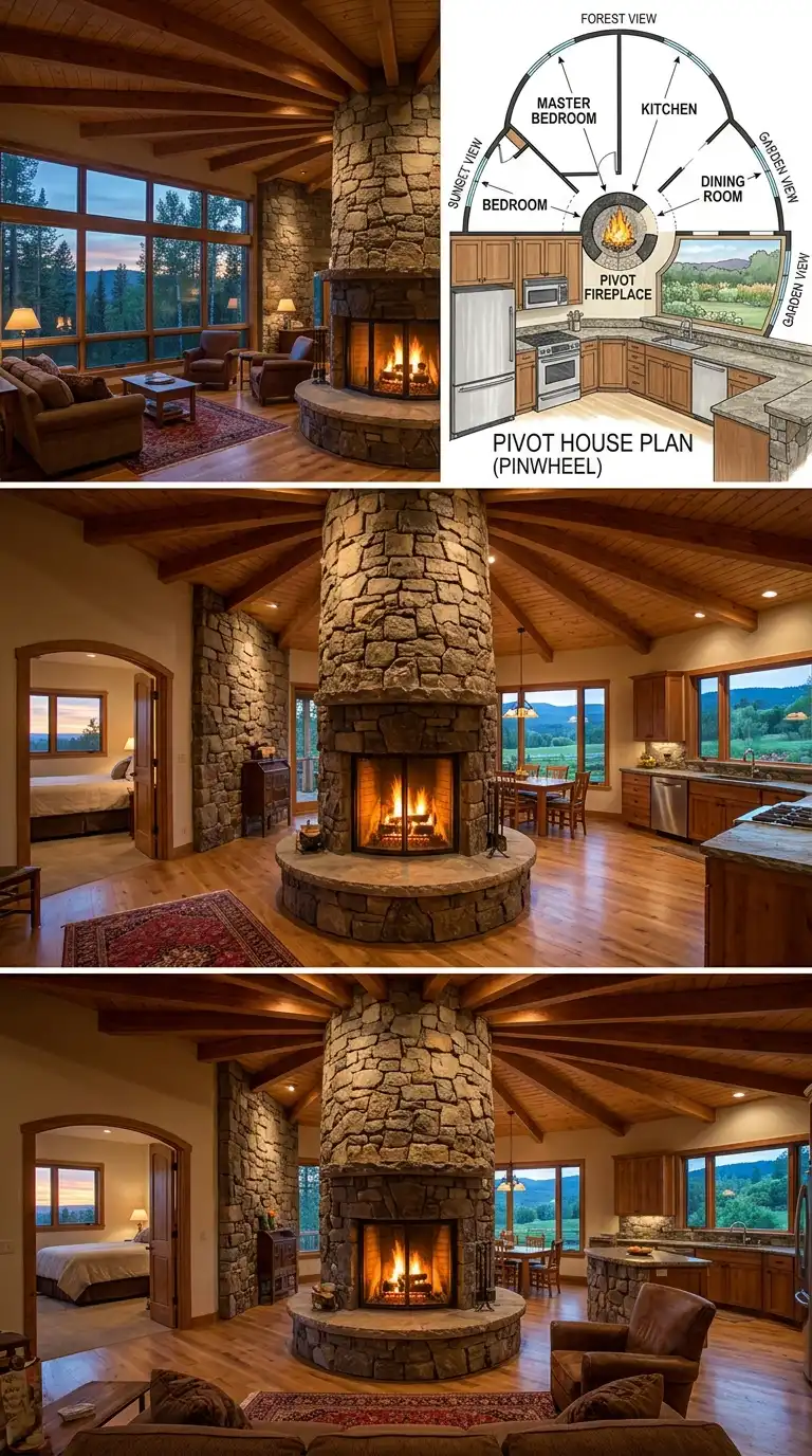 The pivot house is organised around a central pivot point — often a fireplace, a staircase, or a courtyard. All rooms radiate from this pivot. The plan is circular, square, or pinwheel-shaped. The pivot is the heart of the home.