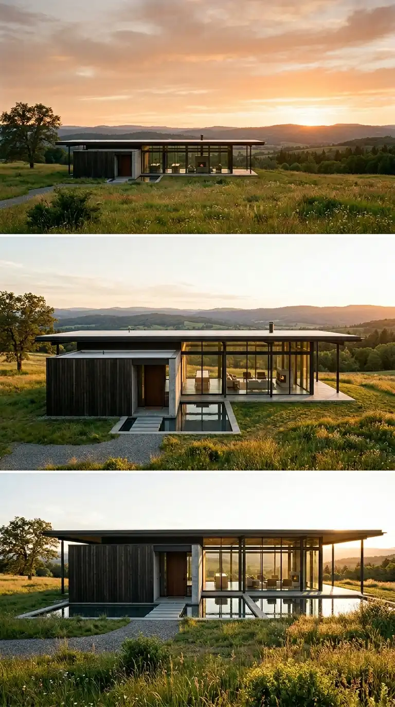 This typology works best on flat, private sites where the view is worth seeing in all directions. The roof overhangs deeply, shading walls and creating covered outdoor space. The emotional effect is calm, spacious, and connected to the landscape.