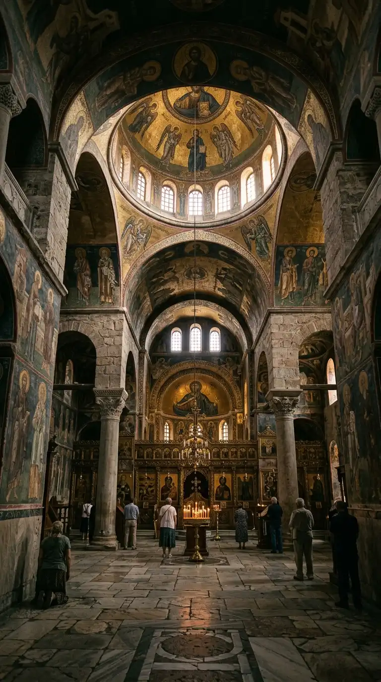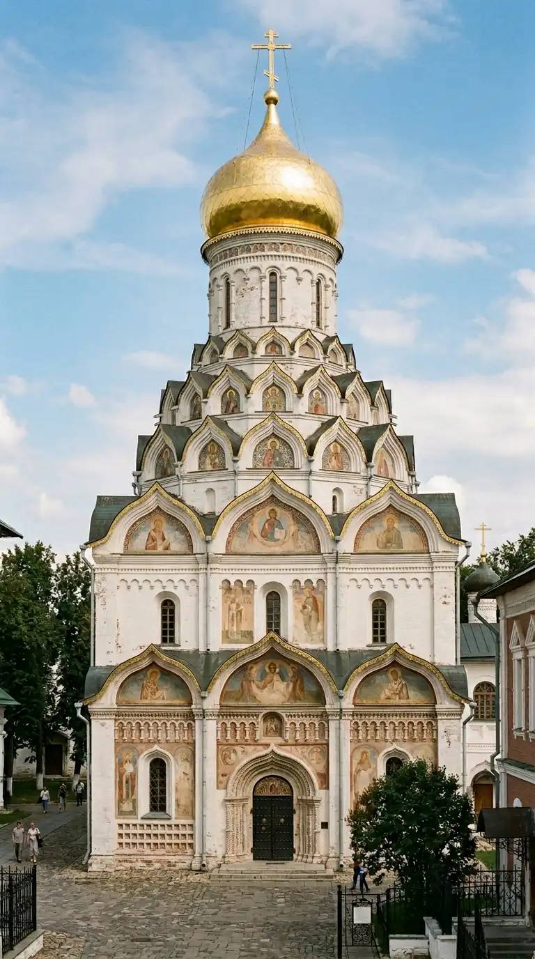St. Sophia Cathedral in Kiev (1037) and St. Sophia Cathedral in Novgorod (1045) are defining examples. The emotional effect is centralised, hierarchical, and mysteriously lit.