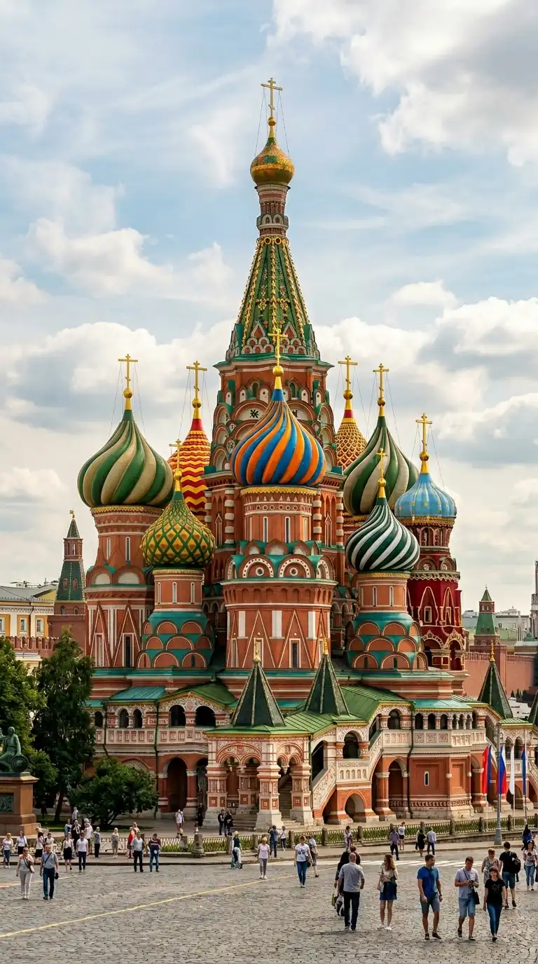 The domes of St. Basil’s Cathedral in Moscow (1561) are the defining example. The emotional effect is vertical, festive, and unmistakably Russian.