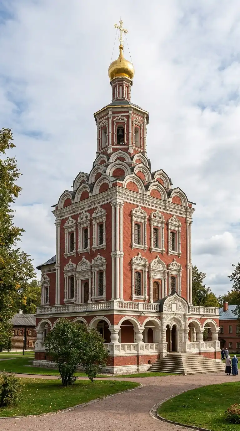 Naryshkin Baroque, also called Moscow Baroque, was the first Russian Baroque style. It combined traditional Russian forms (onion domes, kokoshniks) with Western Baroque ornament. The most distinctive feature is the use of red brick and white stone trim.