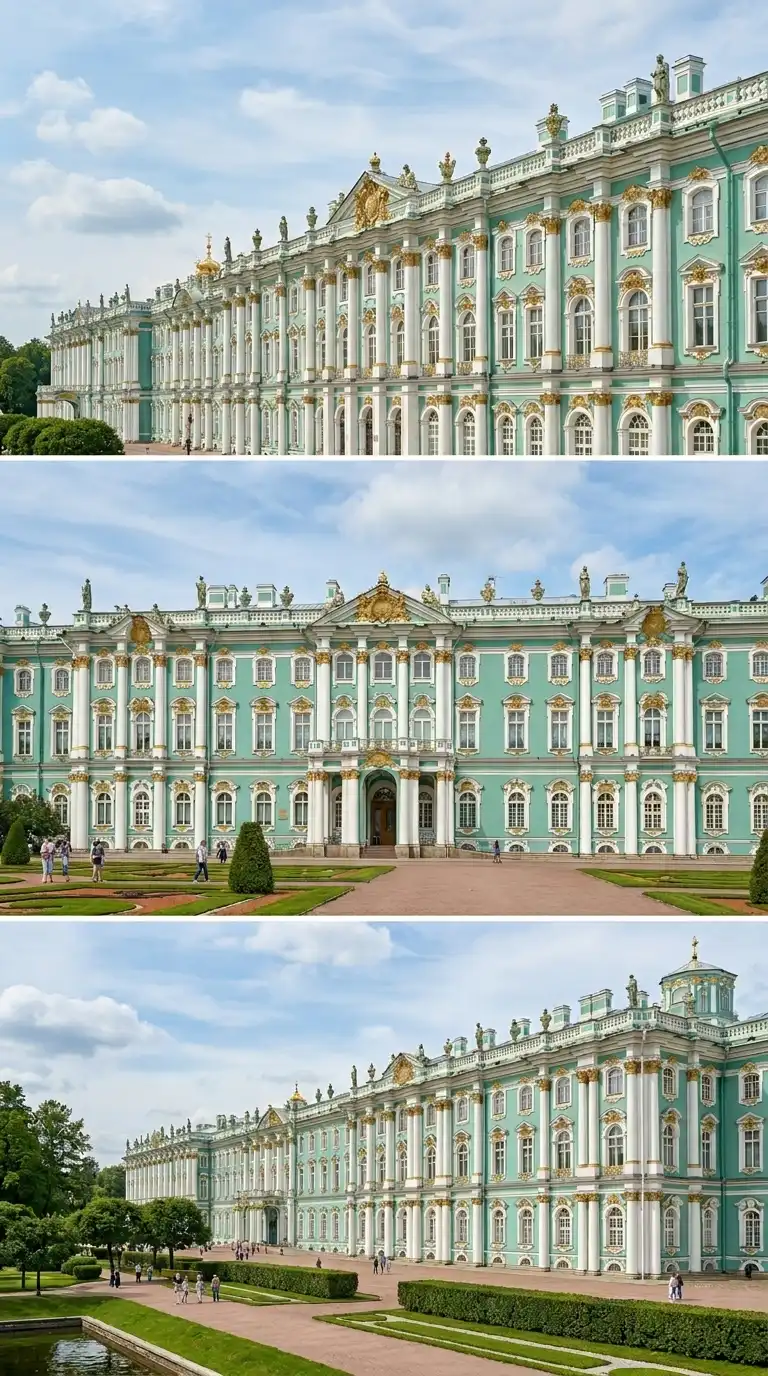 The Russian Baroque palace, built under Empress Elizabeth, is a lavish interpretation of European Baroque. The facades are long and painted in bright colours — pale blue, yellow, pink, green. The windows are framed with white columns and pediments. The roofs are gilded.