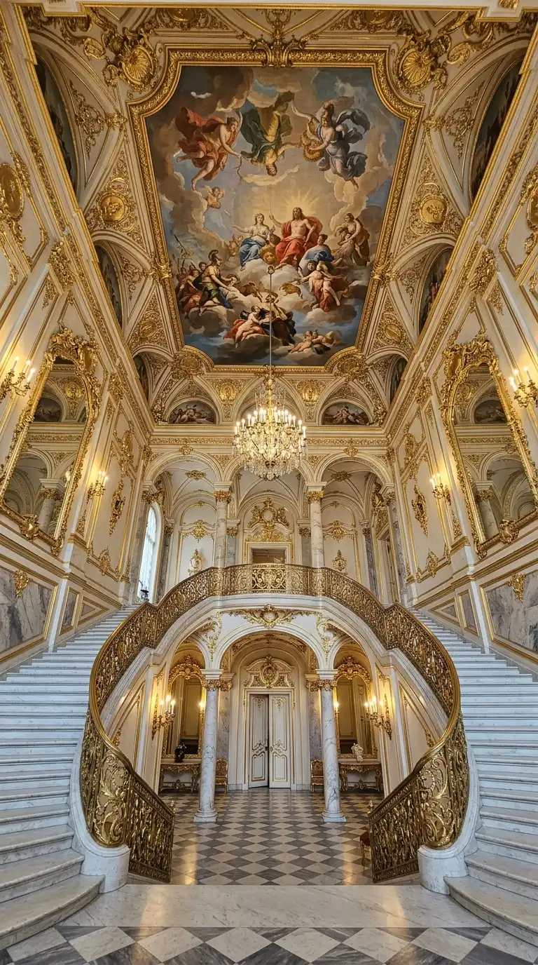 The Rastrelli staircase is a grand, two-flight staircase with a dramatic ceiling. The staircase splits into two flights that curve around an open centre. The ceiling is frescoed with a scene of the gods. The stairs are marble. The walls are gilded.