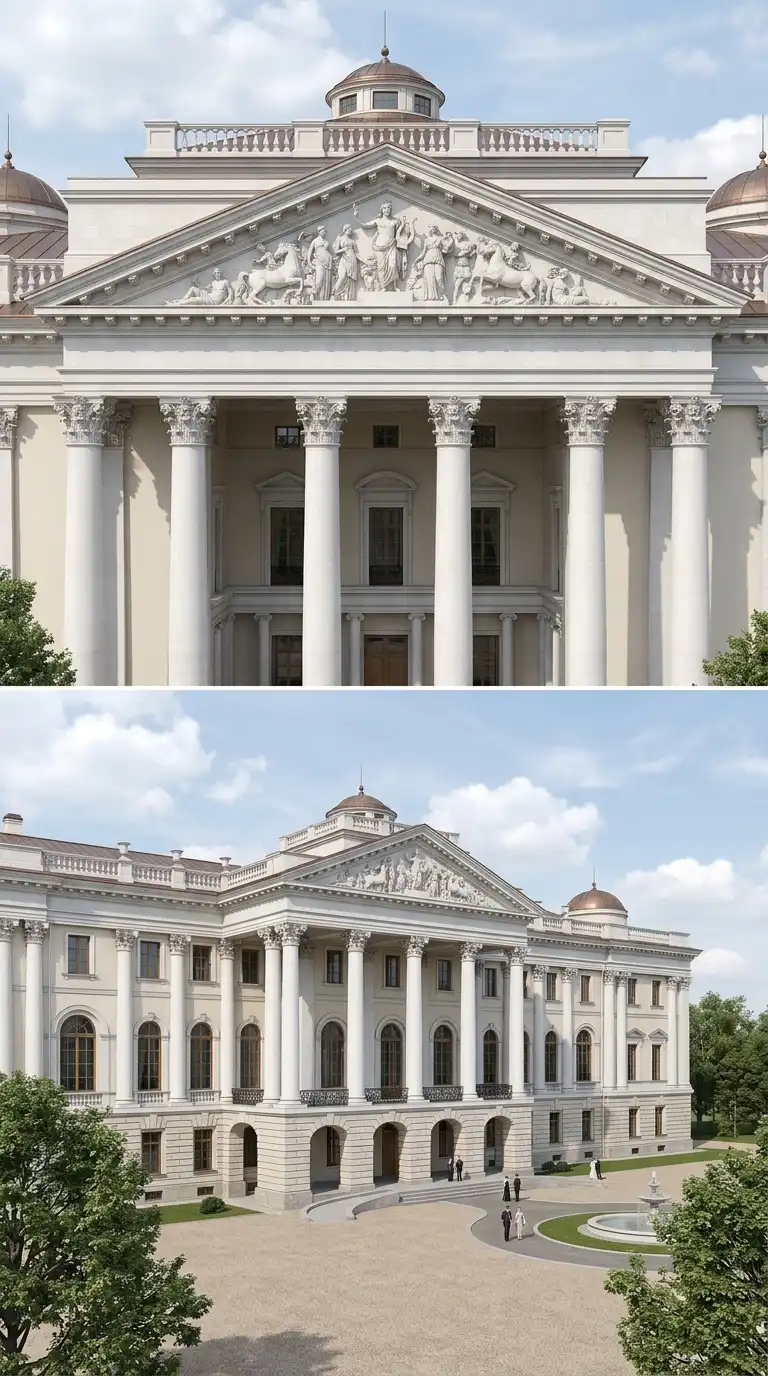 Neoclassicism replaced Baroque in Russia under Catherine the Great. The Russian Neoclassical palace is restrained, rational, and Greek or Roman in inspiration. The facades are symmetrical. Columns are Greek Doric, Ionic, or Corinthian. The colours are natural stone or white.