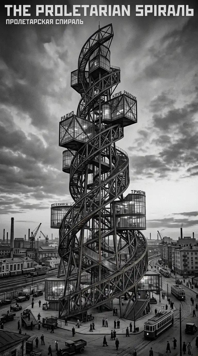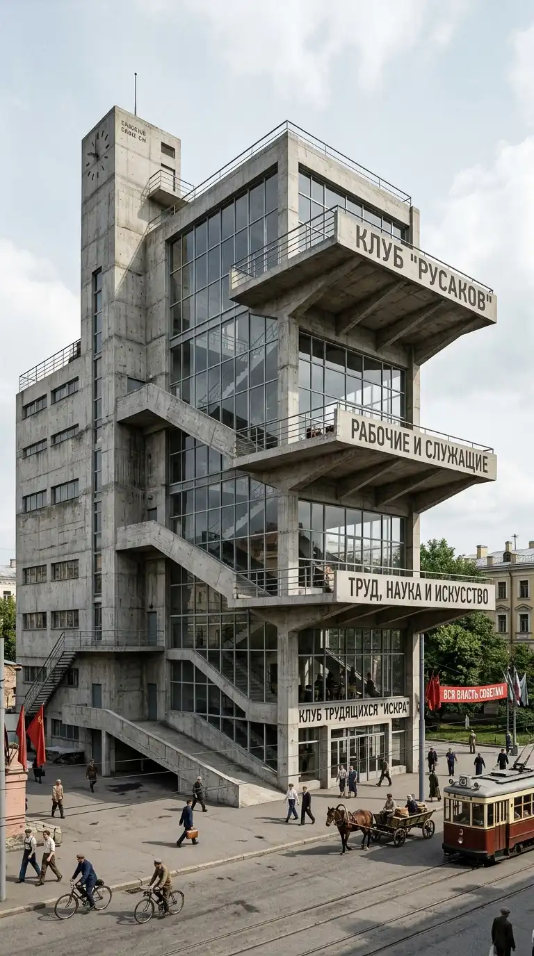 Constructivism was the Russian avant-garde movement of the 1920s. It rejected ornament for pure geometry, industrial materials, and revolutionary forms. The Constructivist tower is a dynamic composition of glass, steel, and concrete.