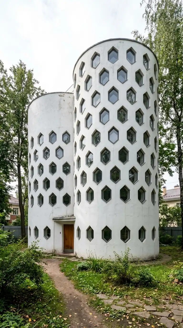 The Melnikov House in Moscow (1929) by Konstantin Melnikov is the most famous Constructivist house. It is a cylindrical tower composed of two intersecting cylinders. The windows are hexagonal, arranged in a dynamic grid. The interior is a single continuous space.