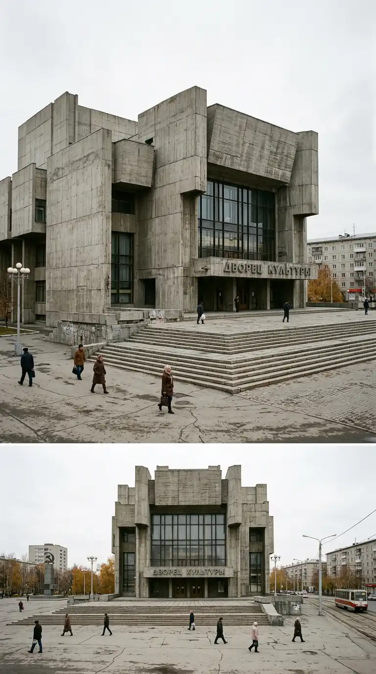 Soviet Brutalism adapted the Western Brutalist aesthetic to Soviet needs. The Palace of Culture is a large, sculptural concrete building containing a theatre, exhibition halls, and meeting rooms. The concrete is board-formed, with visible grain and seam marks.