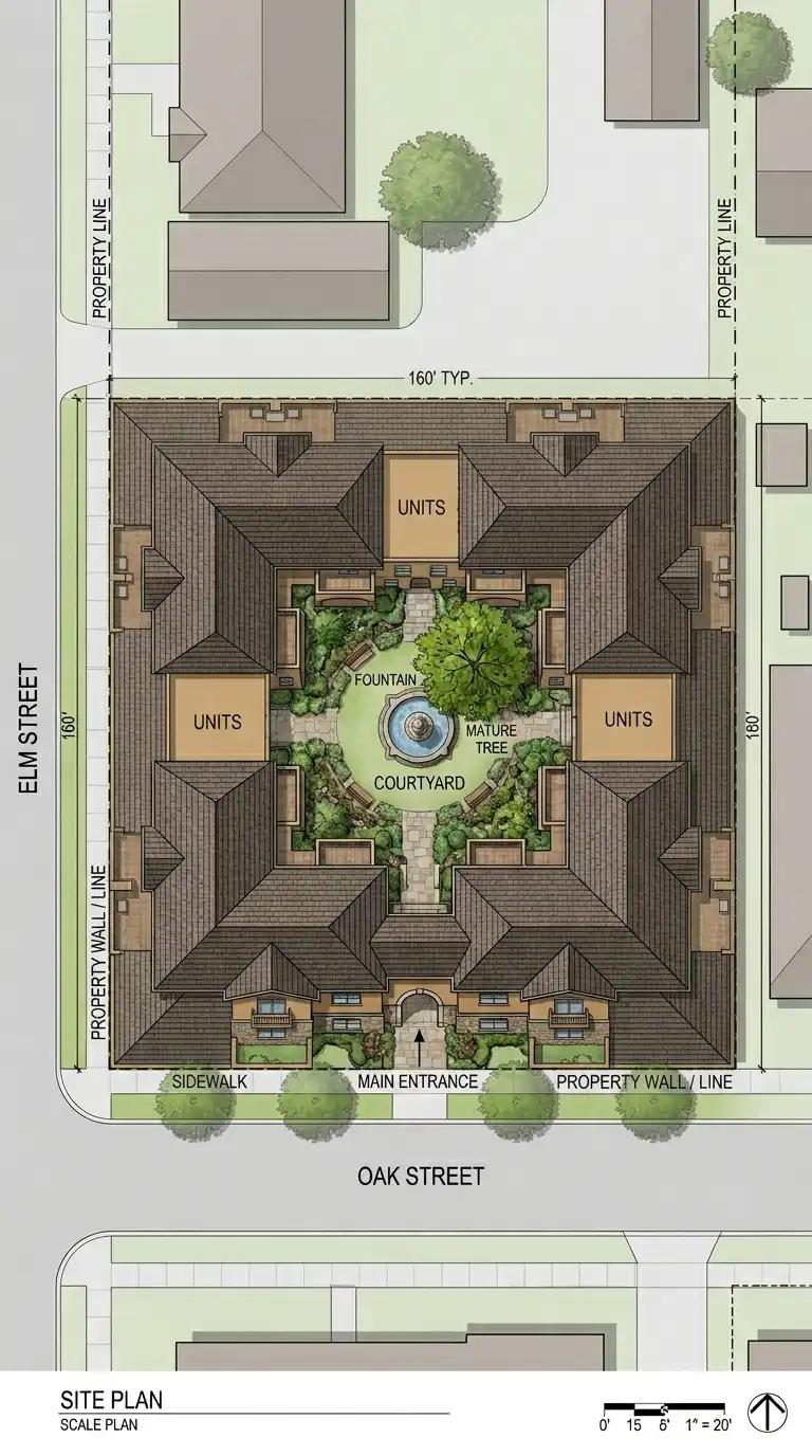 These 16 site plan types are not mutually exclusive. A central courtyard plan can be passive solar. A hillside terrace plan can be clustered pavilions. A mixed-use plan can be a superblock. The best site plans are not the most efficient — they are the most responsive. They respond to the sun, the slope, the view, and the street. They make the building belong to its site.