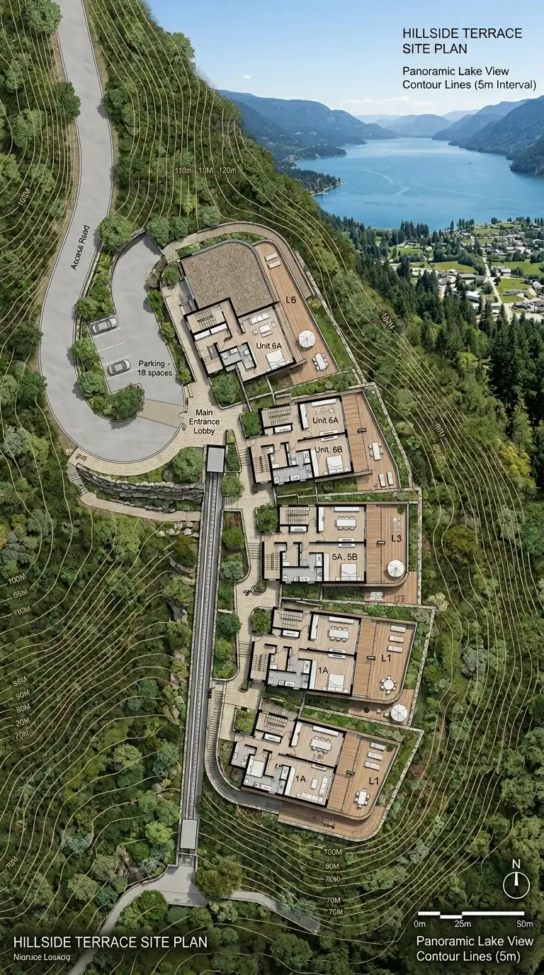 The hillside terrace site plan steps the building down a slope. Each building terrace is cut into the hill, with the roof of the lower terrace becoming the terrace of the unit above. The site plan follows the contour lines. The building is invisible from below, visible from above.