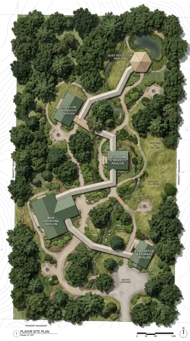 The clustered pavilion site plan spreads multiple small buildings across the site. Each pavilion has a single function. Covered walkways connect the pavilions. The landscape flows between and around the buildings. The site is as important as the architecture.