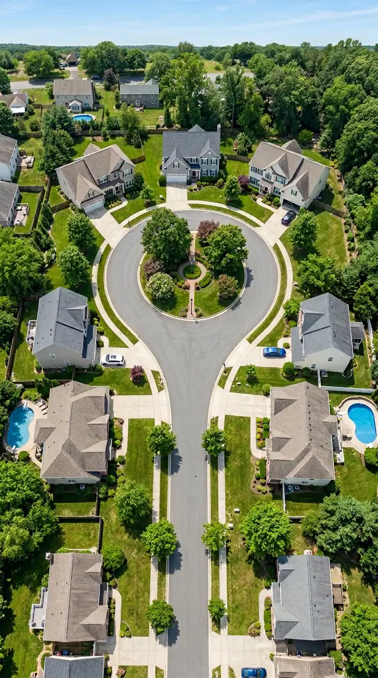 The cul-de-sac site plan uses a dead-end street with a circular turnaround. Houses are arranged around the cul-de-sac. The street is quiet and safe for children. The cul-de-sac is a common suburban pattern.