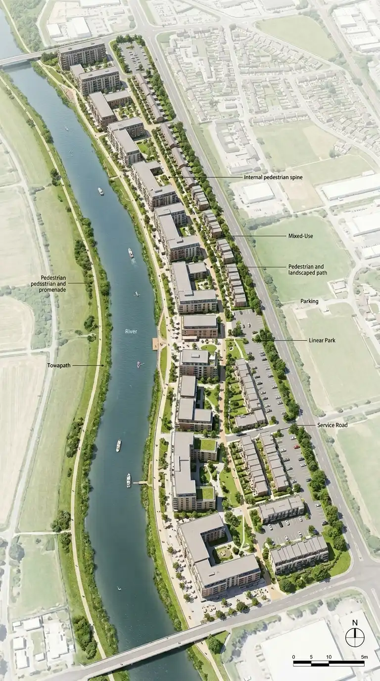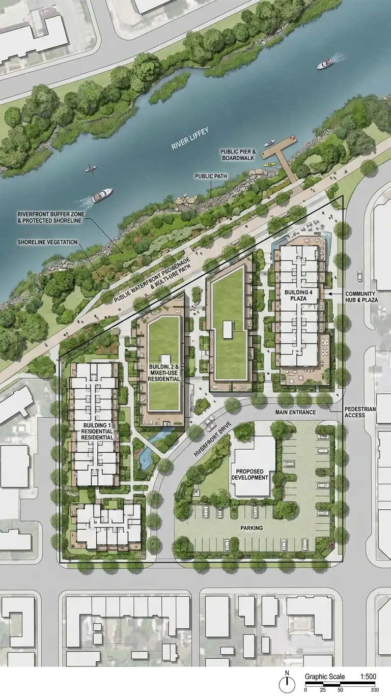 The waterfront site plan is organised around a body of water — a lake, river, or ocean. Buildings face the water. Public access to the water is provided. The site plan protects the shoreline from erosion and development.