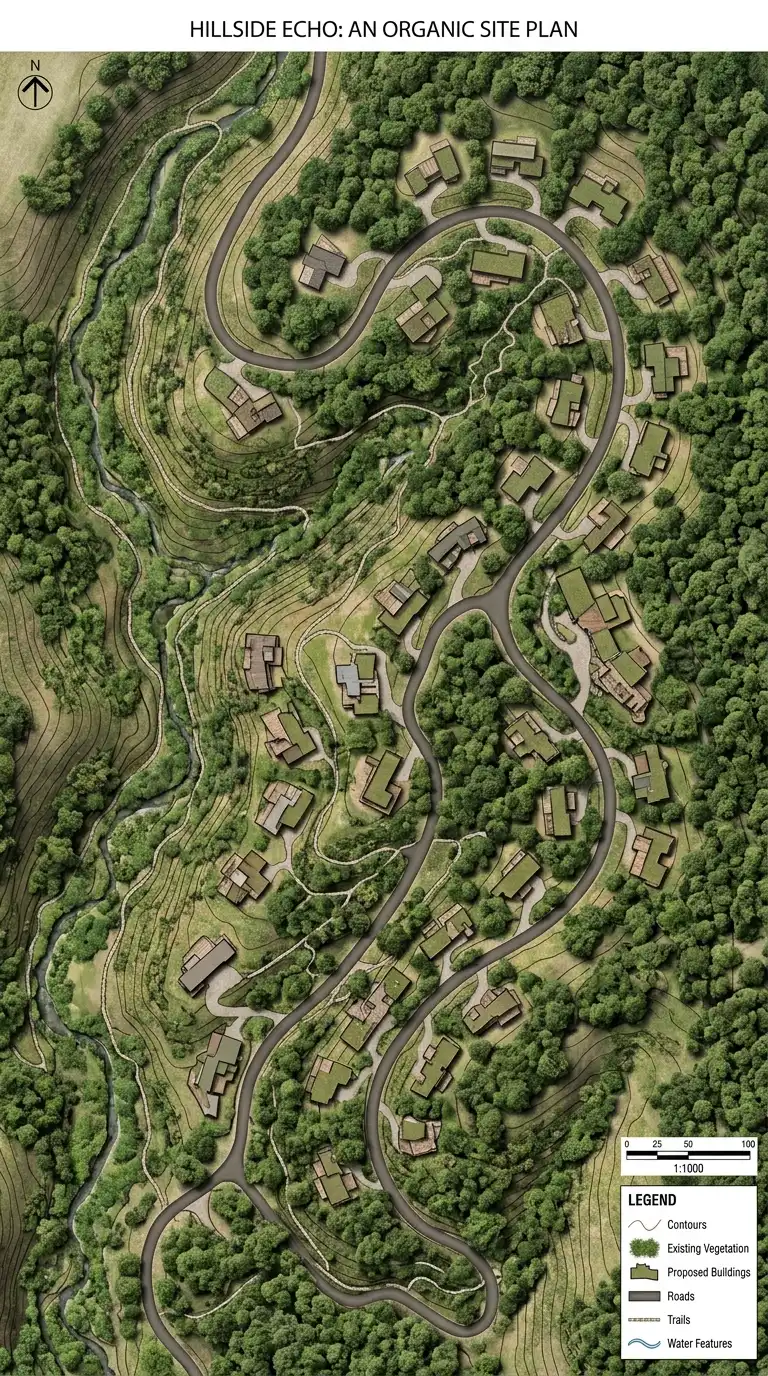 The organic site plan follows the natural forms of the land. Streets curve, buildings are irregular, and open space is preserved. The plan looks like it grew from the site, not imposed upon it.