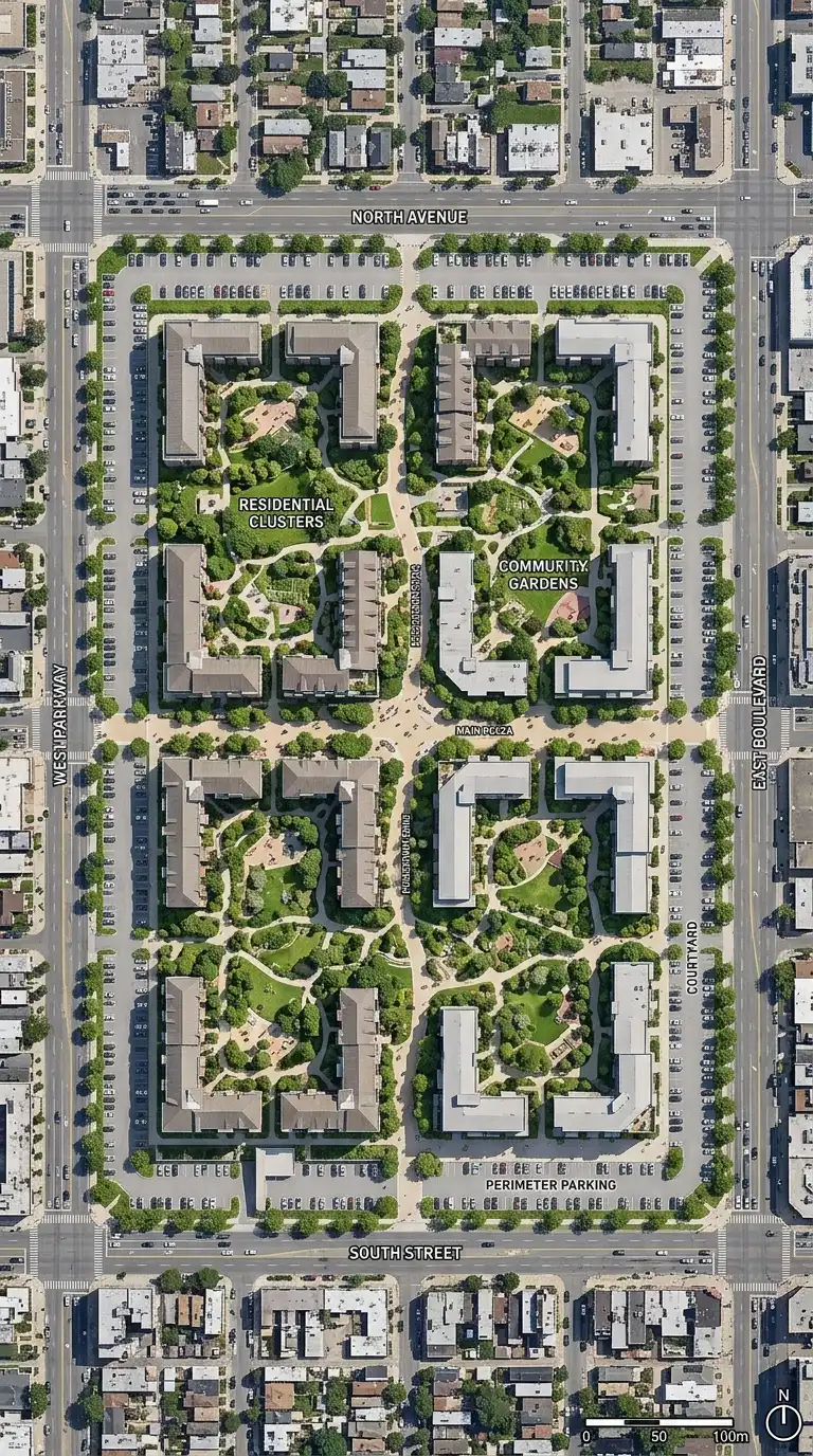 The superblock site plan replaces the traditional street grid with large blocks. The interior of the block is pedestrian-only, with buildings arranged around courtyards. Parking is on the perimeter or underground. The superblock is a modernist planning ideal.