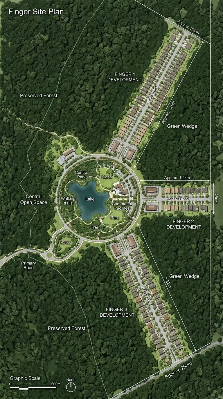 The finger site plan extends fingers of development into preserved open space. Each finger is a linear cluster of buildings. The fingers are separated by green wedges that penetrate from the perimeter to the centre. The plan preserves open space while allowing development.