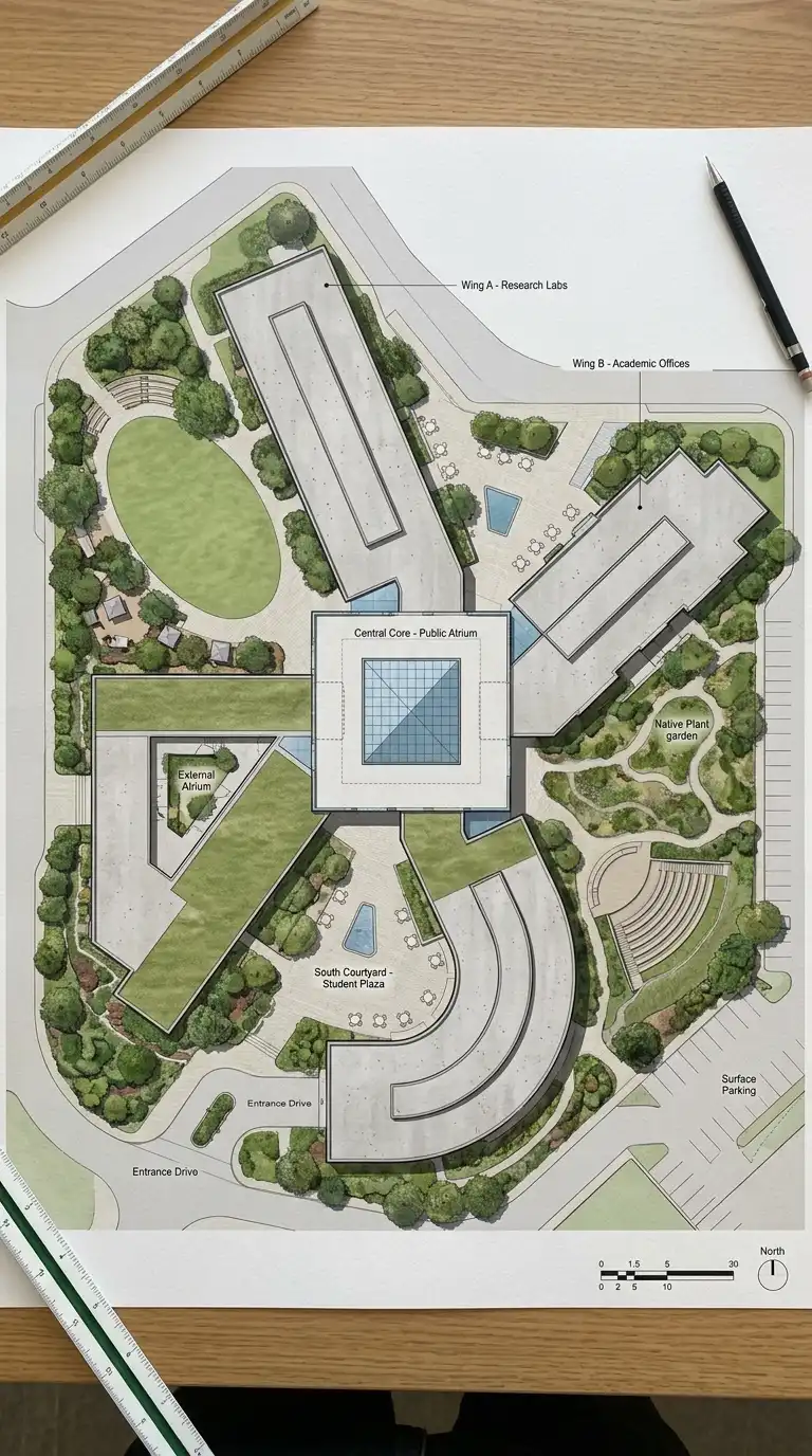 This design is ideal for dense urban development and campus plans. The emotional effect is pedestrian-friendly, green, and modern.
