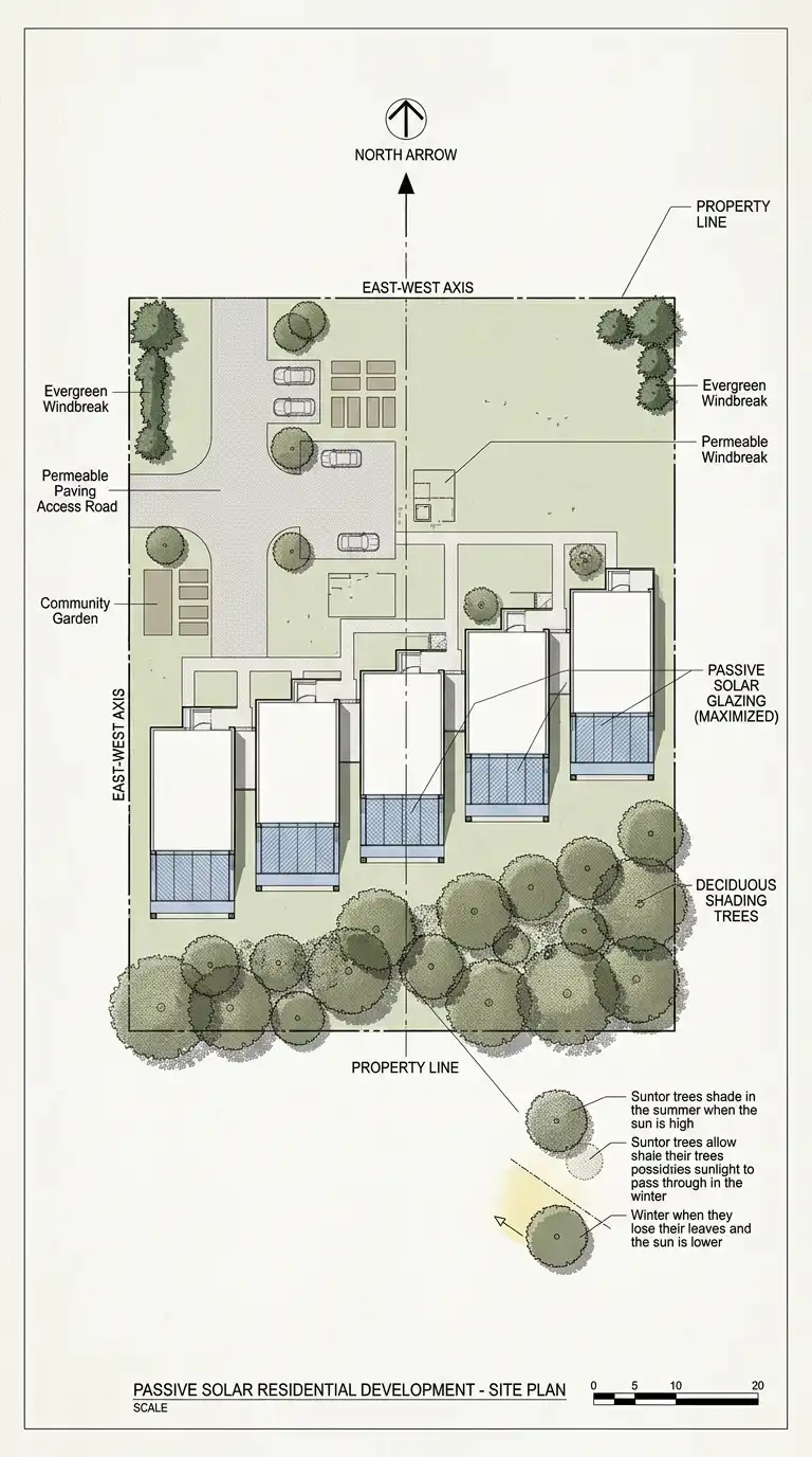 The passive solar site plan is oriented for maximum solar gain. The long axis of the site runs east-west. Buildings are placed on the south side of the site, with south-facing glazing. Deciduous trees shade the south facade in summer, admit sun in winter.