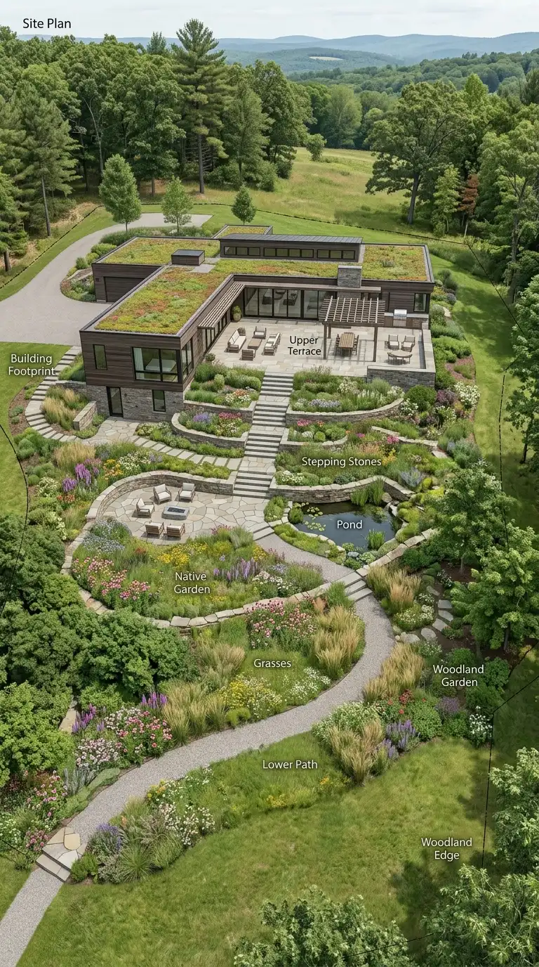This design is ideal for warm climates and sites with good soil. The emotional effect is green, terraced, and garden-integrated.