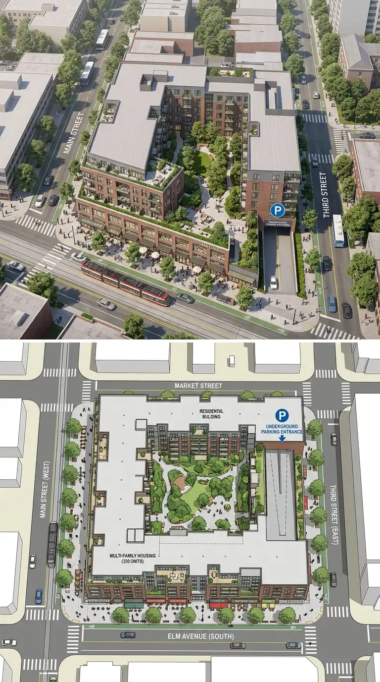 This design is ideal for urban infill and transit-oriented development. The emotional effect is urban, walkable, and diverse.