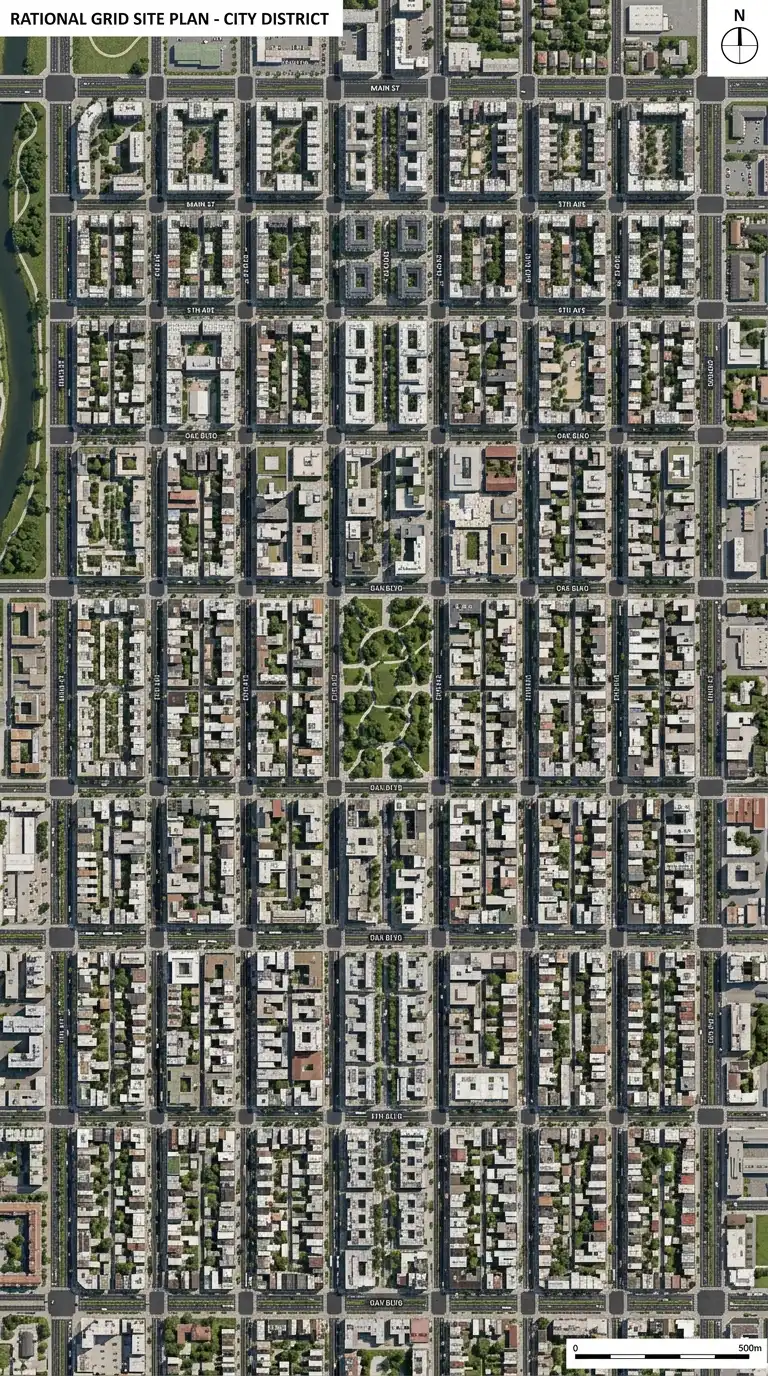 The grid site plan organises the site with a regular orthogonal grid. Streets, buildings, and plots are aligned to the grid. The grid is rational, efficient, and expandable. The grid can be rotated to respond to sun or view.
