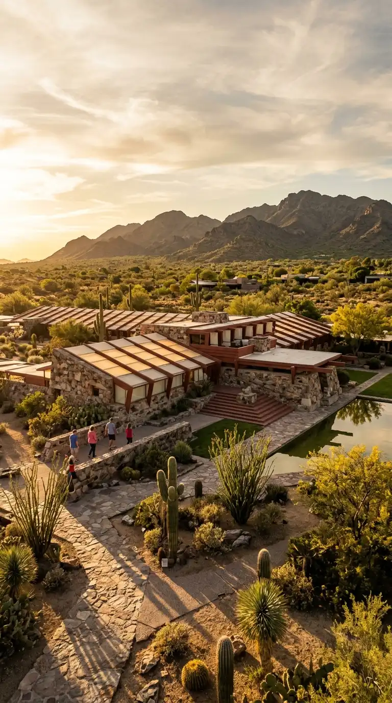 Taliesin West was Wright’s winter home and studio in the Arizona desert (1937). The building is constructed of local materials: desert concrete (stone and concrete mixed on site), redwood, and canvas. The roofs are translucent canvas panels that filter the harsh desert light.