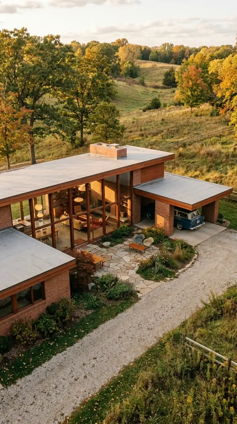 The house is built of local materials: brick, concrete, redwood, and glass. The roof is flat with deep overhangs. The windows are floor-to-ceiling glass opening onto the courtyard. The emotional effect is warm, domestic, and integrated with its garden.