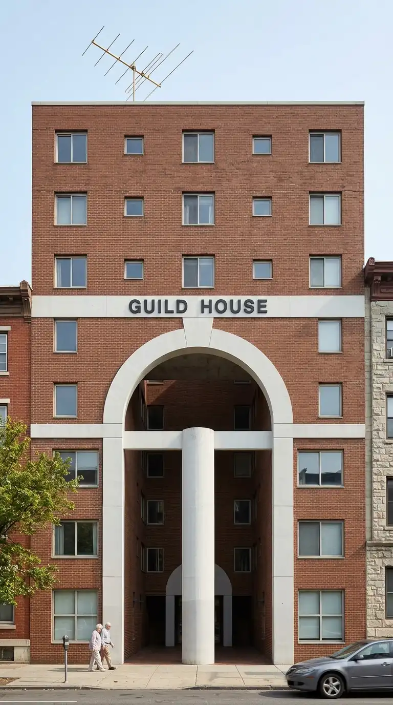 The Guild House in Philadelphia (1960-1963) by Louis Kahn is not a single-family home but a residence for the elderly. Kahn called it a “community of rooms” — a building where each resident has a private room but shares communal spaces. The building is brick, concrete, and glass, organised around a central courtyard.
