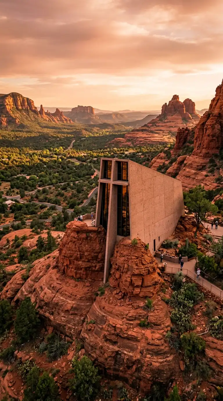 The building does not sit on the rock — it emerges from it. The concrete matches the red rock colour. The glass wall faces the valley. The emotional effect is spiritual, dramatic, and completely integrated with its monumental site.