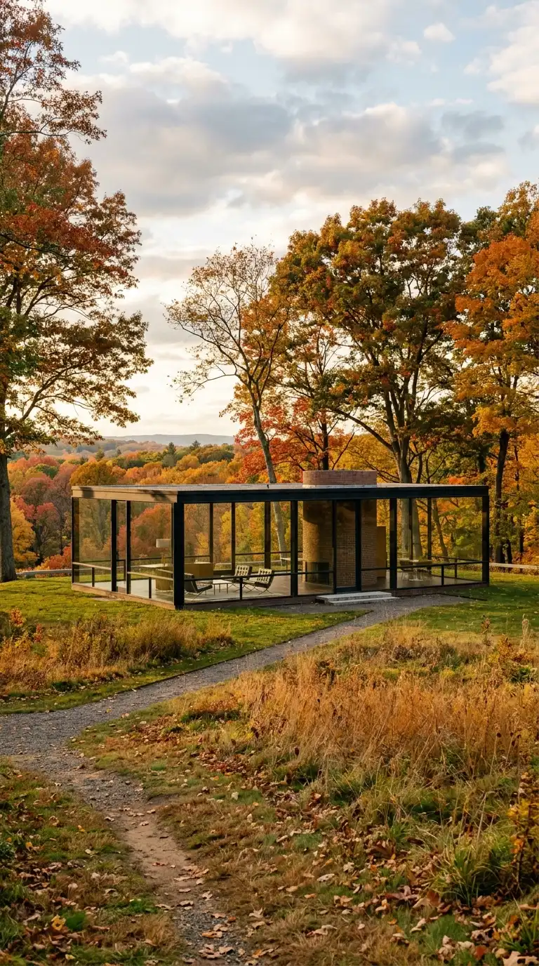The house is a single rectangular volume: glass walls, a steel frame, a brick core for the bathroom and fireplace. The building sits on a stone terrace overlooking a pond. The emotional effect is transparent, weightless, and intimately connected to the changing seasons.