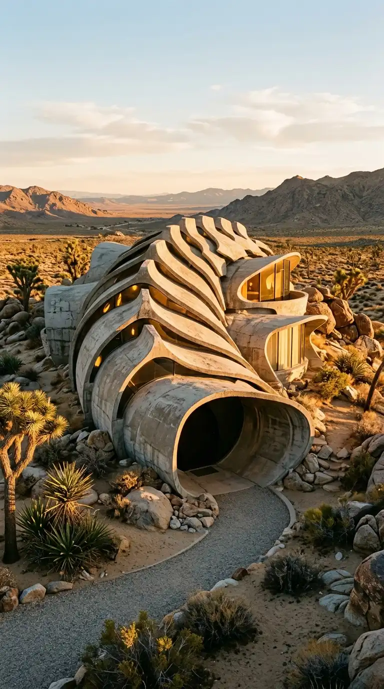 The building does not have a single straight line or right angle. It grows from the desert floor like a fossilised creature. The emotional effect is primordial, otherworldly, and deeply connected to the desert.