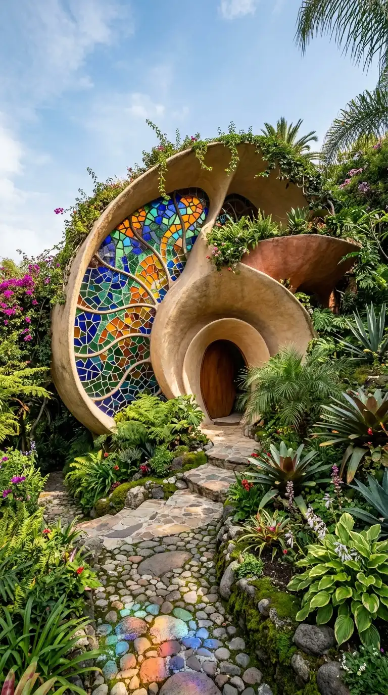 The form is explicitly organic — a shell that provides both structure and enclosure. The house is surrounded by a garden that flows over and around it. The emotional effect is playful, protective, and biomorphic.