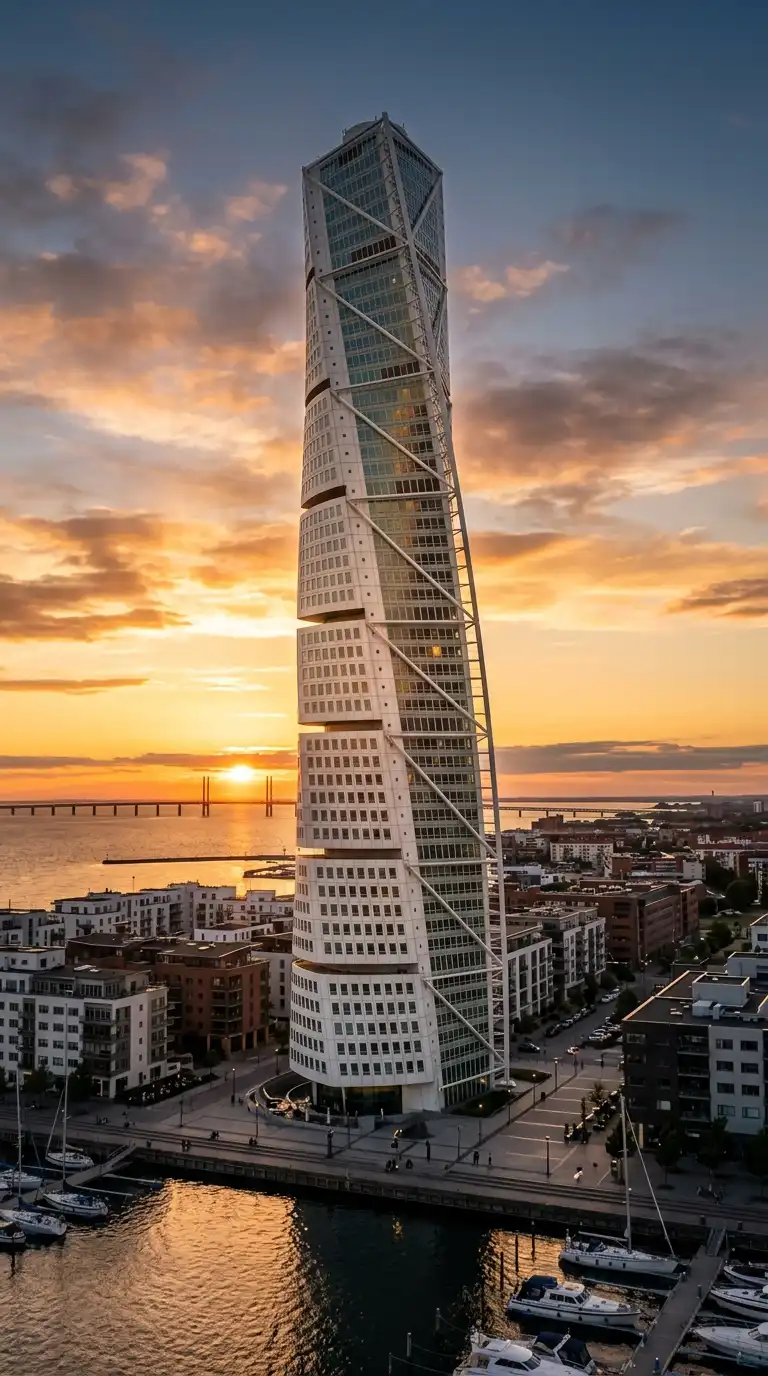 The Turning Torso in Malmö, Sweden (2005) by Santiago Calatrava is a skyscraper shaped like a twisting human spine. The building is nine cubes, each rotated slightly relative to the one below, creating a 90-degree twist from base to top.