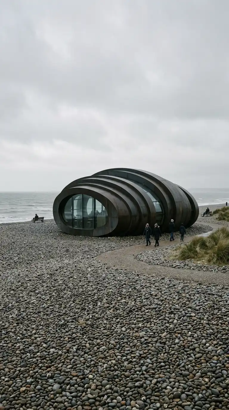 The form is explicitly organic — a stone on the beach. The material is industrial, but the shape is natural. The emotional effect is surprising, sculptural, and perfectly appropriate to its coastal site.