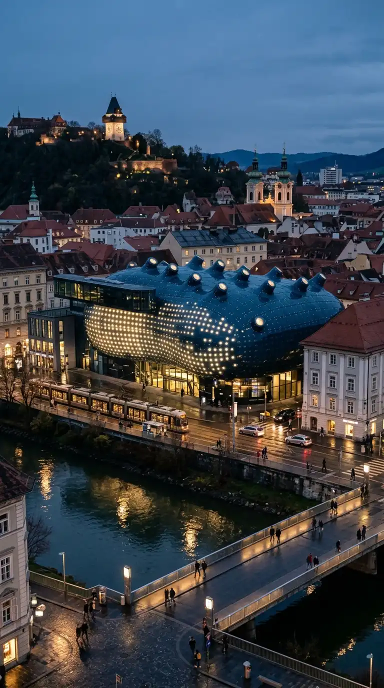 The Kunsthaus Graz in Austria (2003) by Peter Cook and Colin Fournier is shaped like a giant blue blob. The building is called the “Friendly Alien” because it looks like an organic creature that landed in the historic city. The skin is a blue acrylic shell with glowing nozzles that display digital art.
