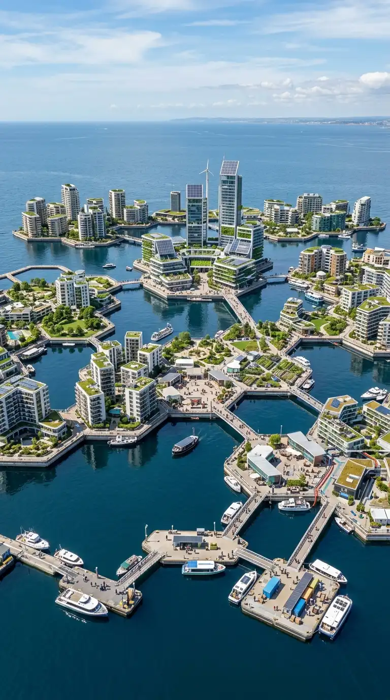 What if a city could float on water? The floating city is built on interconnected platforms that rise and fall with tides and storms. The city can be towed to new locations, expanded indefinitely, or reorganised as needed. Platforms support buildings, streets, parks, and infrastructure.