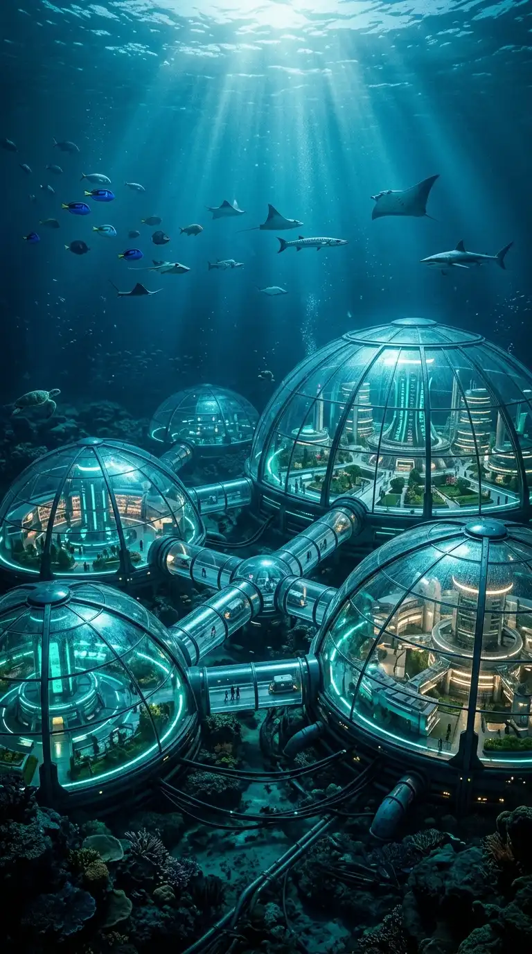 What if a city could be built underwater? The underwater city is sealed within transparent domes or tunnels. Light enters from above. The city is accessible by submarine, elevator, or tunnel from the shore. Residents live beneath the waves.