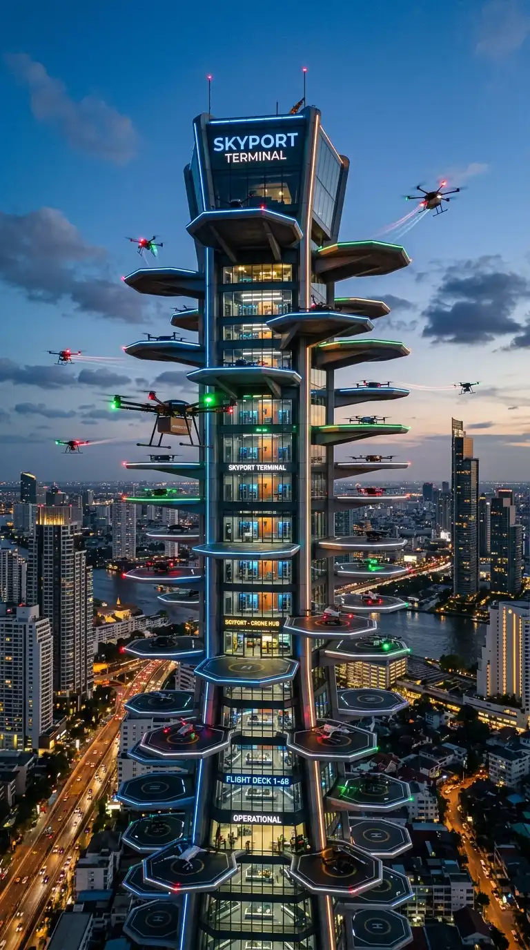 What if buildings were designed for drones? The drone port is a tower or platform for autonomous delivery drones. Drones land on external perches, deposit packages in chutes, and recharge at wireless pads. The building is a hub in the drone network.