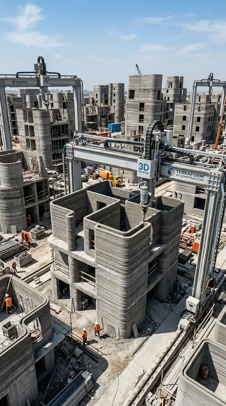 What if an entire city could be 3D printed? The 3D-printed city is built by robotic printers extruding concrete, polymer, or local soil. Buildings are printed in place, layer by layer. The city is organic, customised, and rapidly deployable.