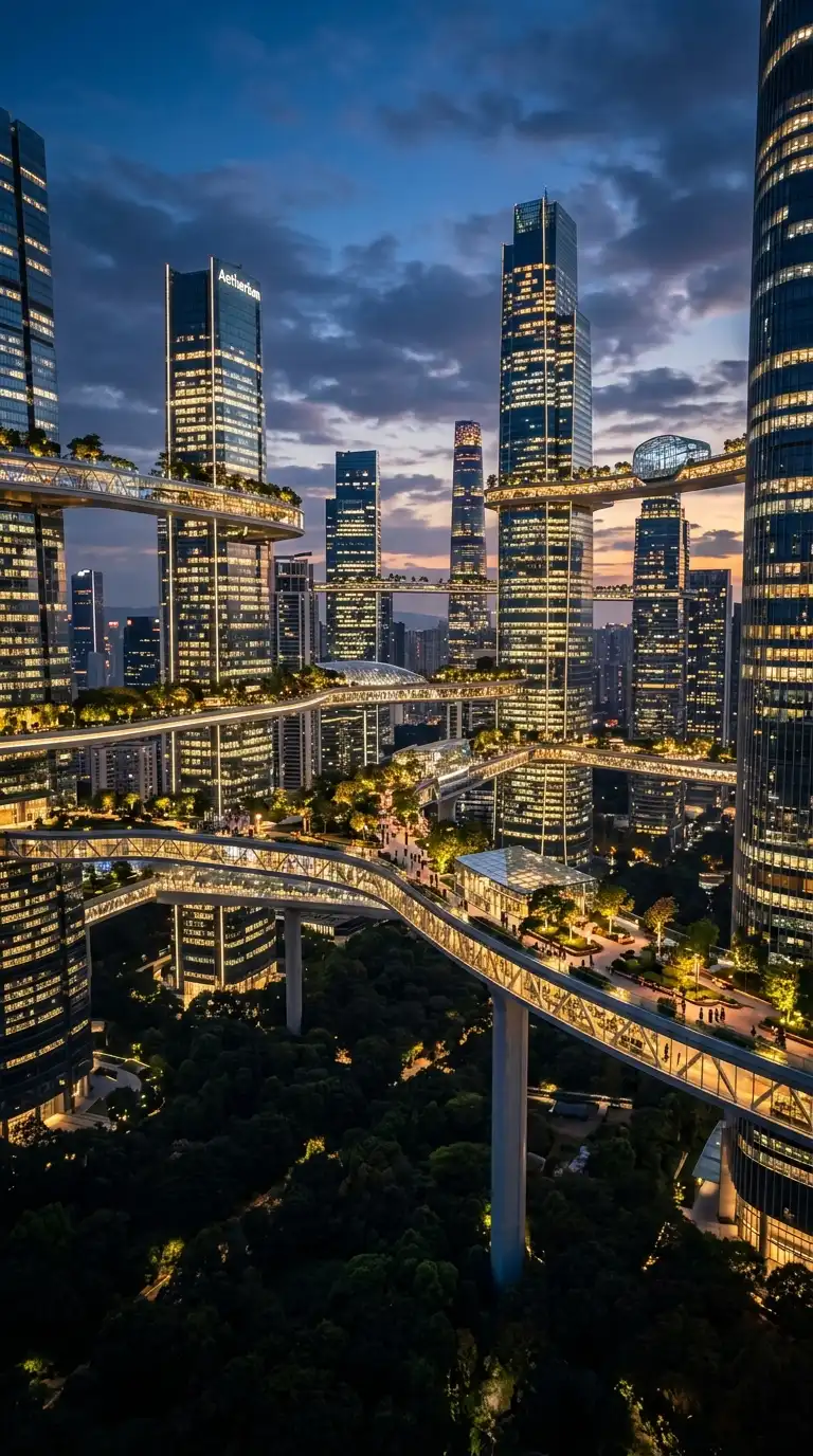 What if buildings were connected by bridges at high levels? The skybridge city is a network of bridges connecting towers at the 20th, 40th, and 60th floors. The bridges contain parks, shops, and public spaces. The streets are in the sky.