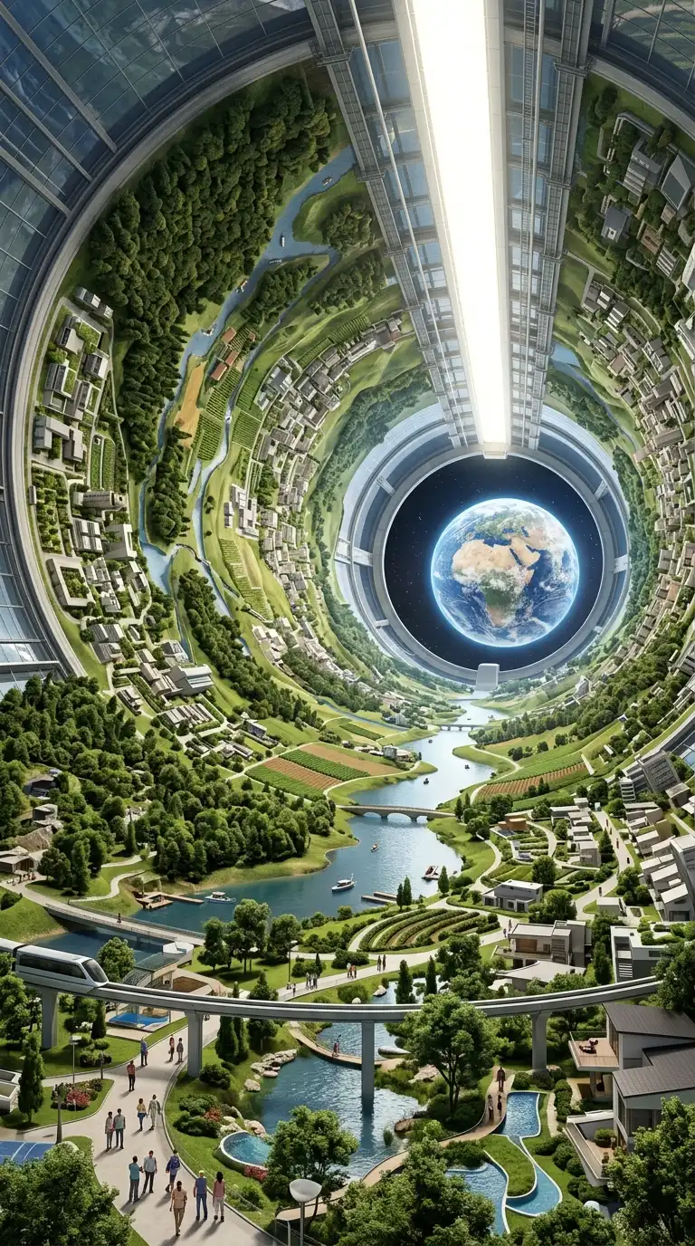 What if a city could orbit the Earth? The space habitat is a rotating cylinder or torus that provides artificial gravity through centrifugal force. The interior is a landscape — hills, rivers, buildings, and sky. The habitat is self-sufficient in energy, water, and food.