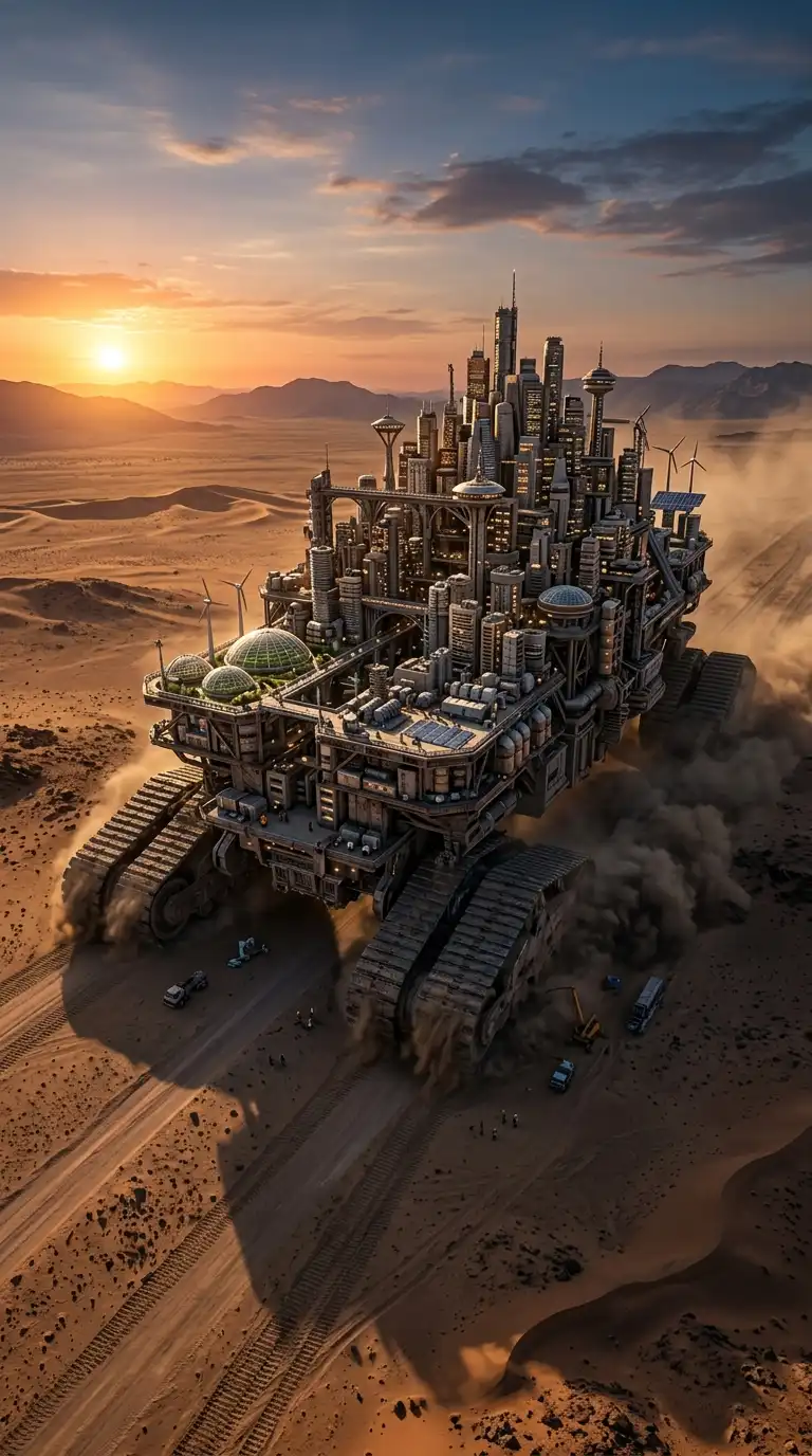 What if a city could move? The mobile city is built on giant tracked platforms or wheels. The city moves slowly across the landscape, following resources, escaping threats, or exploring new territories. The city is a vehicle.