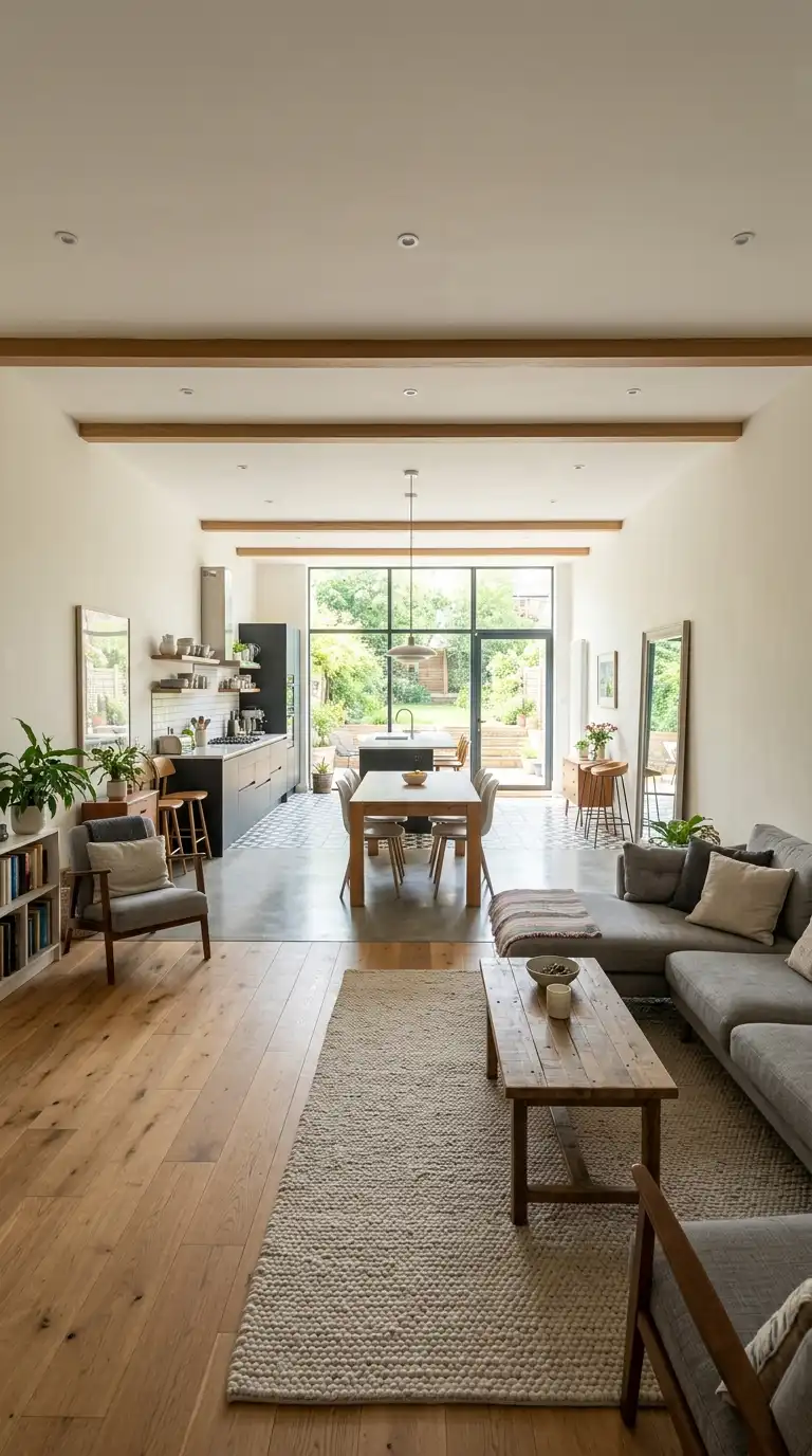 The open plan removes interior walls, creating a single continuous space. Living, dining, and kitchen flow into each other. The space is defined by furniture, lighting, and changes in ceiling height, not by walls.