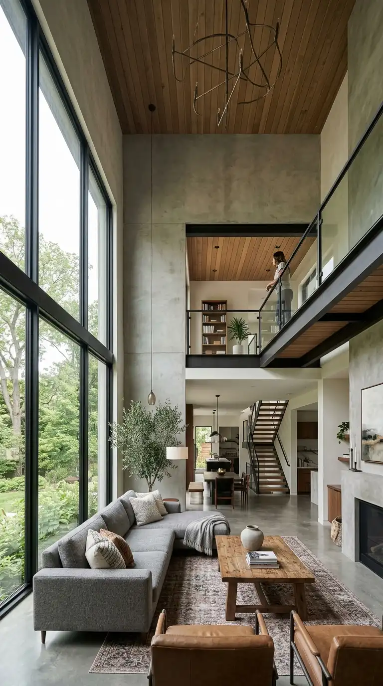 The double-height space is created by removing part of an upper floor, allowing the ceiling to rise two storeys. The space is dramatic and luminous. A balcony or bridge may surround the double-height area on the upper level.