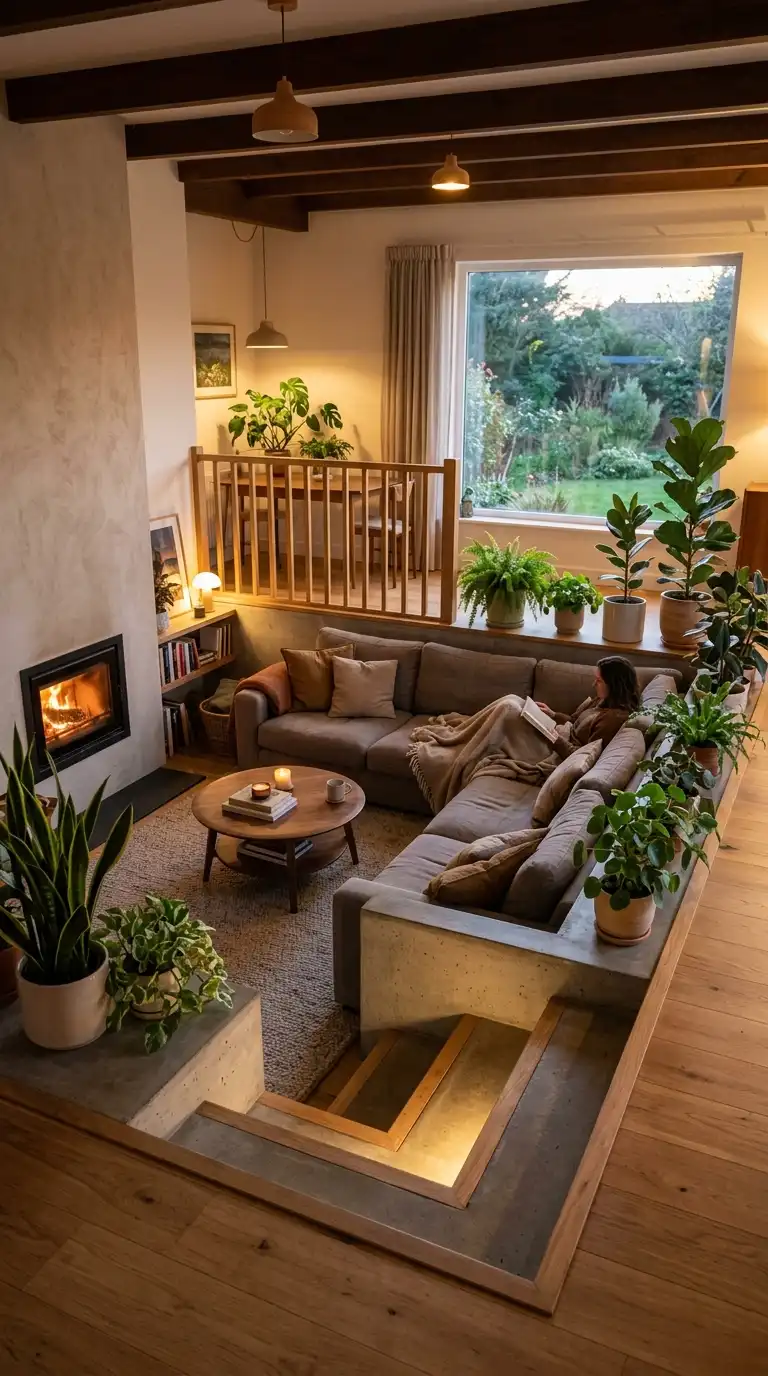 The sunken living room is lowered one or two steps below the main floor level. The change in level defines the space without walls. The sunken area feels intimate and protected.