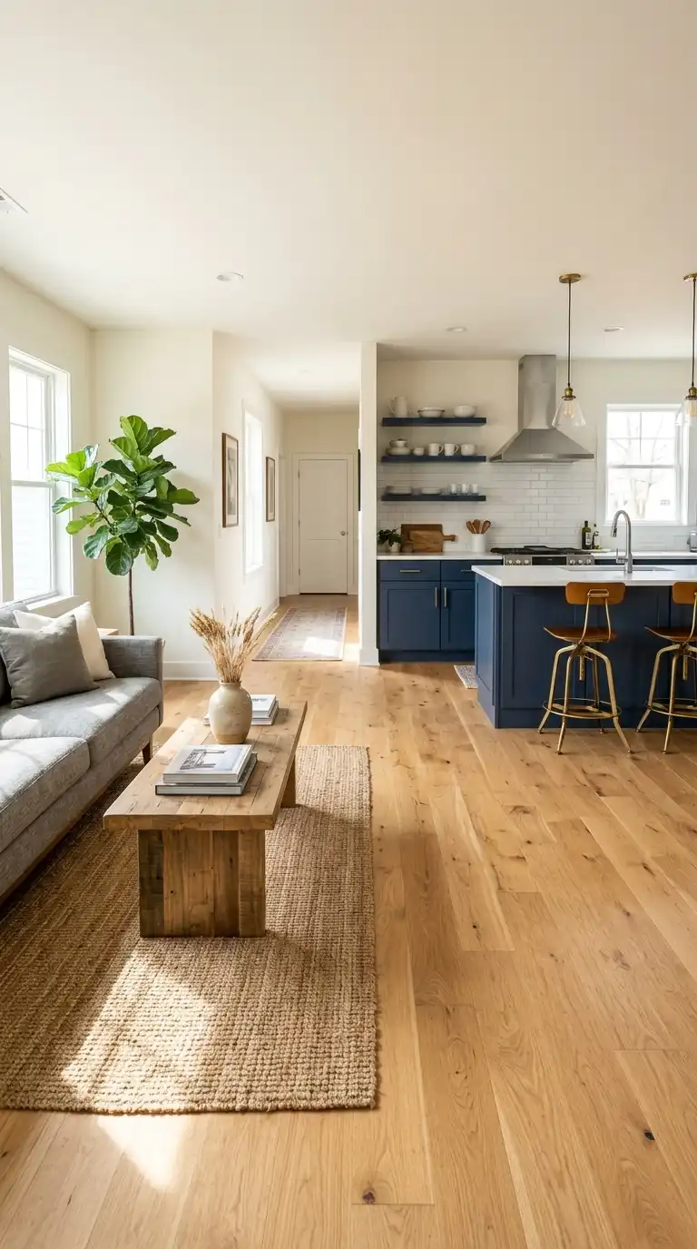 Using the same flooring material across multiple rooms creates visual continuity. The floor flows from space to space without thresholds or transitions. The space feels larger and more unified.