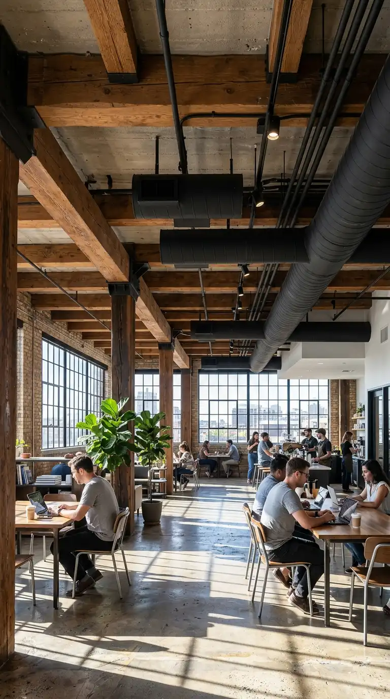 The exposed structure leaves beams, columns, and ducts visible instead of hiding them. The structure becomes the ornament. The space is honest and industrial.